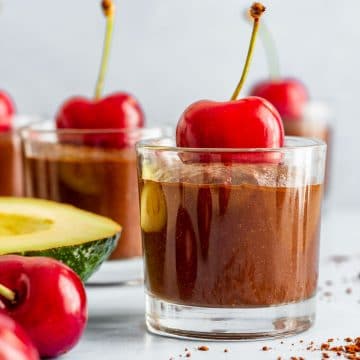 Avocado chocolate mousse with cherries is a simple summer recipe. This avocado dessert is sweet, creamy and chocolate-y with a subtle cherry flavor.