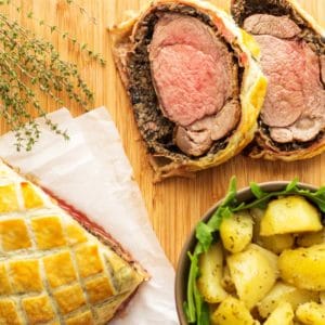 I remember my first time ever seeing beef wellington. It was while watching one of Gordon Ramsay’s Hell’s Kitchen episodes where the cooks had tried over and over to cook it right. At first, I wasn’t impressed by it a lot to be honest. I don’t eat beef much and also meat in a pastry wasn’t exactly what I would choose in a restaurant. But my boyfriend insisted on making it one day for me! (I think he watched too many Hell’s Kitchen shows hahaa).