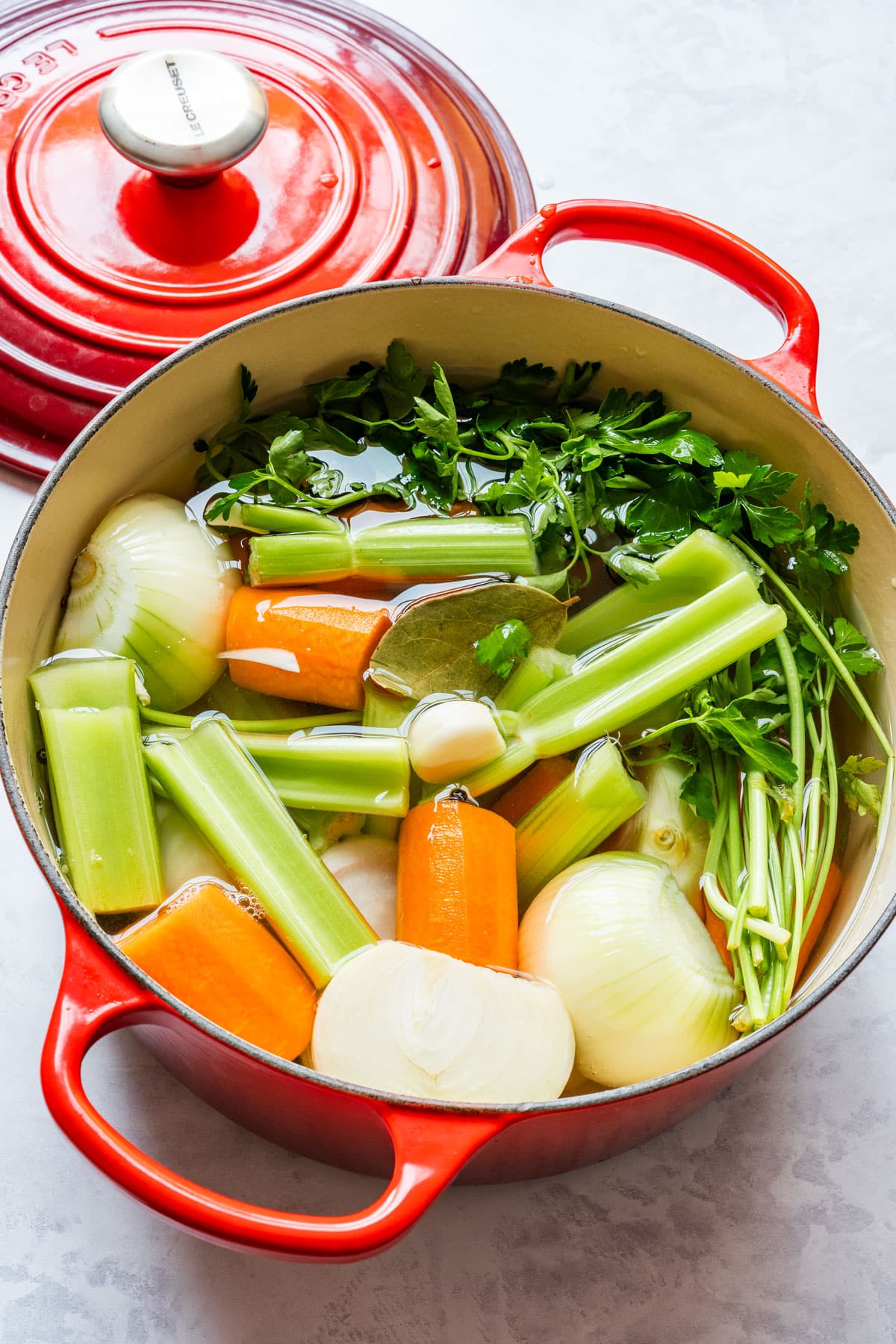 - Add everything to a medium pot or Dutch oven (at least 4 quarts/4 liters): 3 large onions (peeled, quartered), 4 large carrots (peeled, cut into chunks), 6 celery stalks (cut into chunks), 6 garlic cloves, 1 bay leaf, 10 black peppercorns, 1 teaspoon salt (optional), 8 cups water (about 2 liters), and a bunch of fresh parsley.